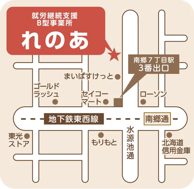 事業所の場所は、地下鉄東西線南郷7丁目駅の3番出口から、徒歩1分と好立地です。
